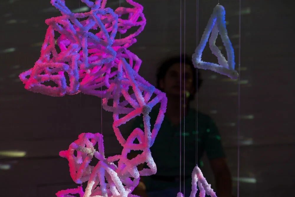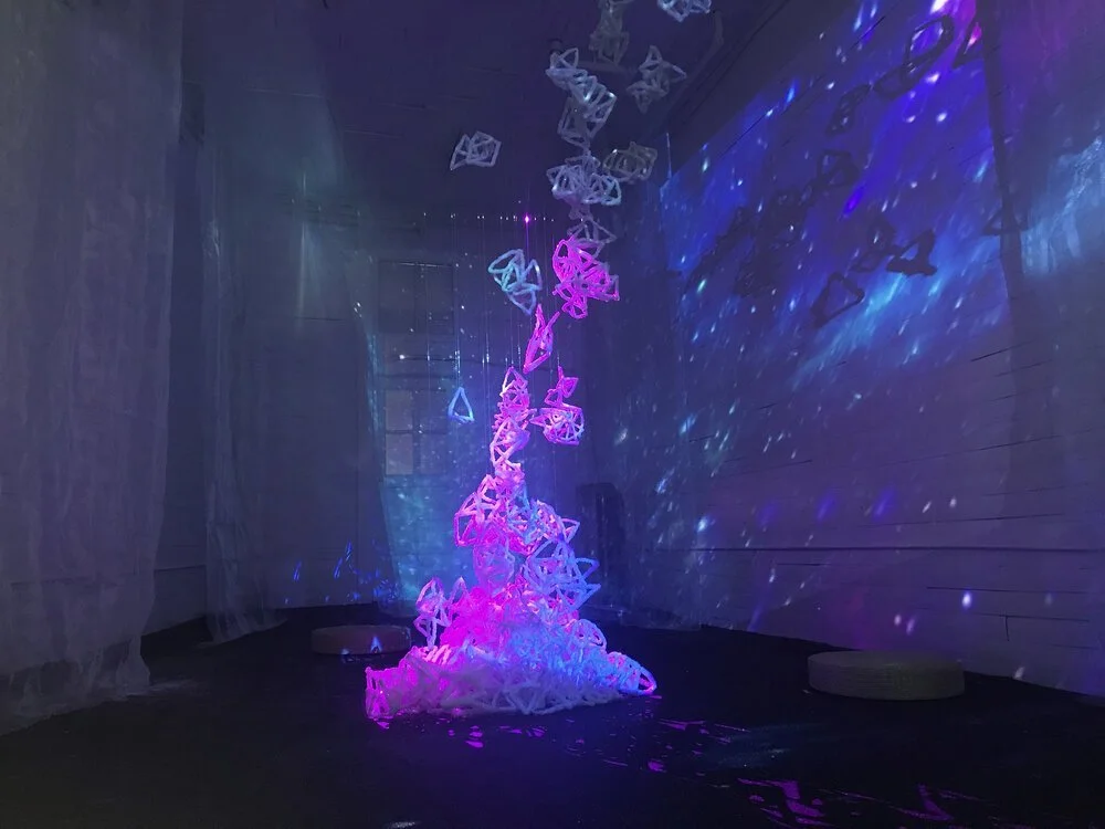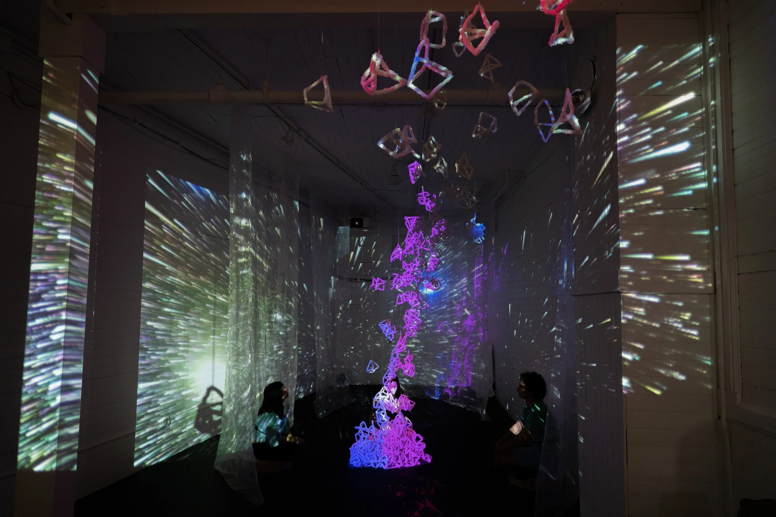 Time-Link Present was a temporary installation at the gallery Installation Space in North Adams, MA, and was created in response to the growing interest in the mindfulness practice. The crystalline structures that spanned the long interior space of this installation were constructed of hundreds of hand-grown crystals. Through projection mapping and sensor technology, these crystalline formations are brought to life as the viewer is encouraged to sit and put on a sensor belt for a unique experience activated by their breathing.